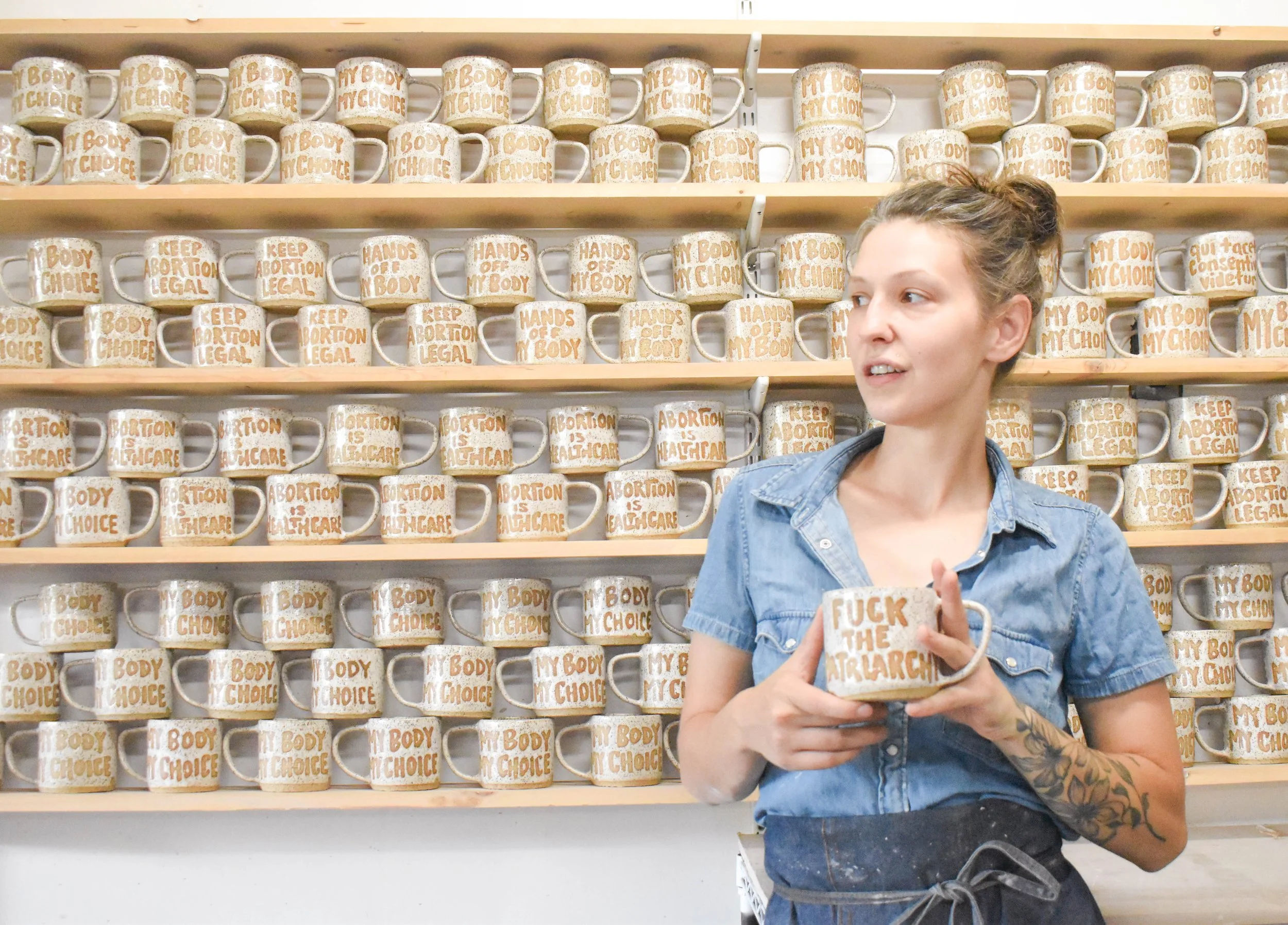 Artist Nicole Helen Brunner standing in front of 100 Pro-Choice Mugs